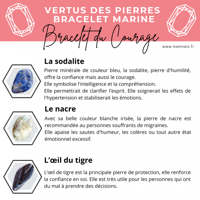 Non seulement il est fabriqué en France, à la main dans notre atelier, mais encore le bracelet d’allaitement Marine est assemblé avec des perles en pierre naturelle qui en fait LE bracelet de la force et du courage grâce aux vertus de la lithothérapie !