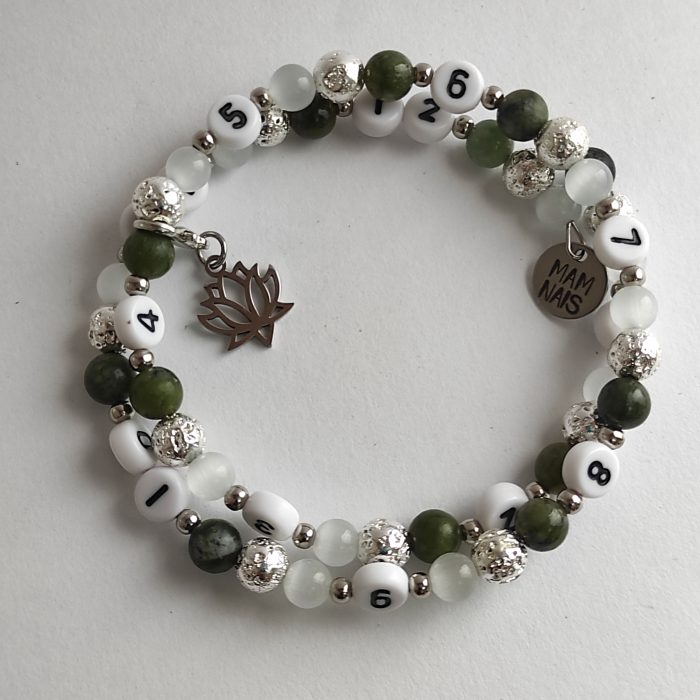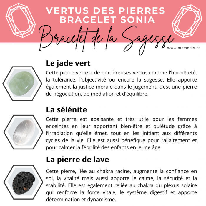 Non seulement il est fabriqué en France, à la main dans notre atelier, mais encore le bracelet d’allaitement Sonia est assemblé avec des perles en pierre naturelle qui en fait LE bracelet de l’équilibre et de la sagesse grâce aux vertus de la lithothérapie !
