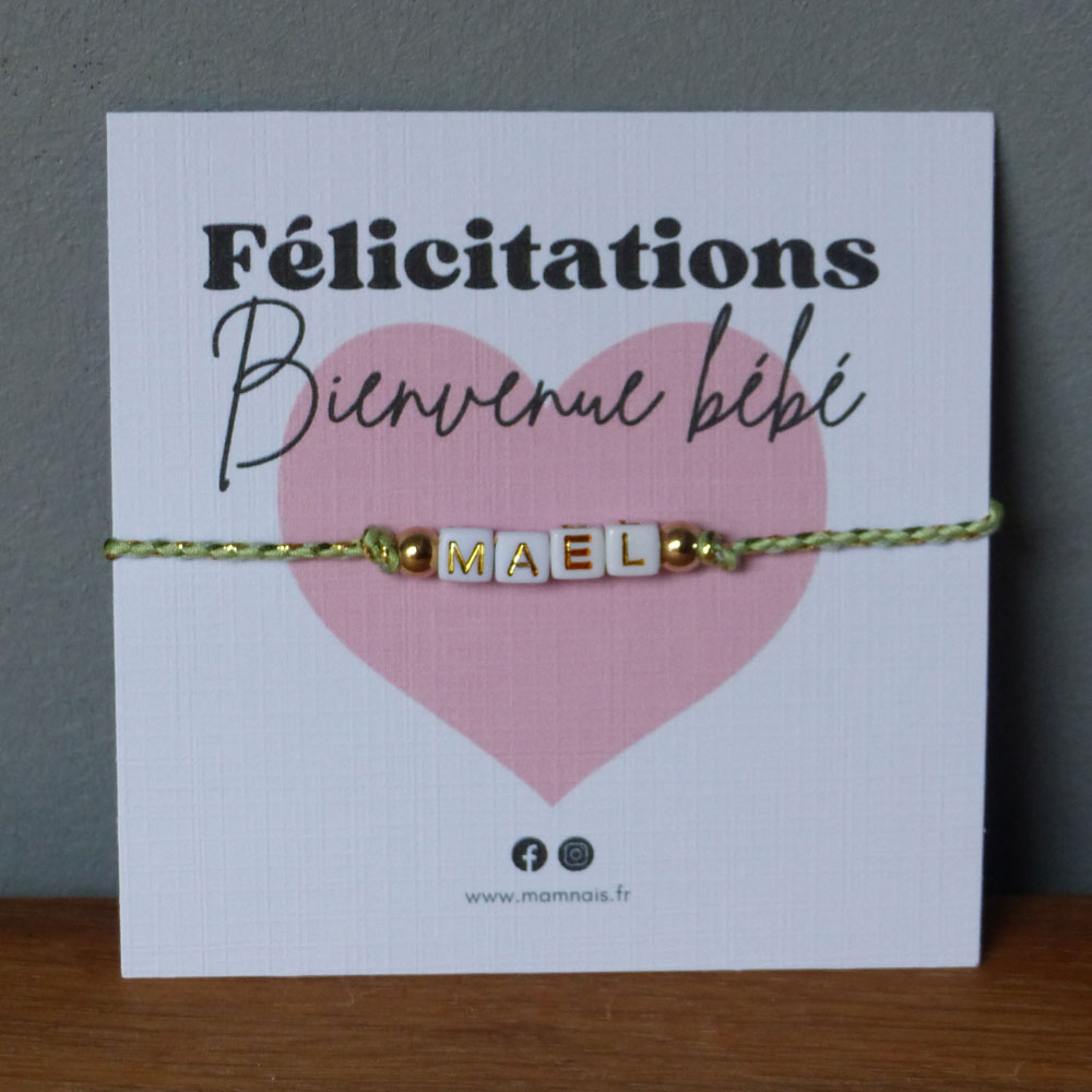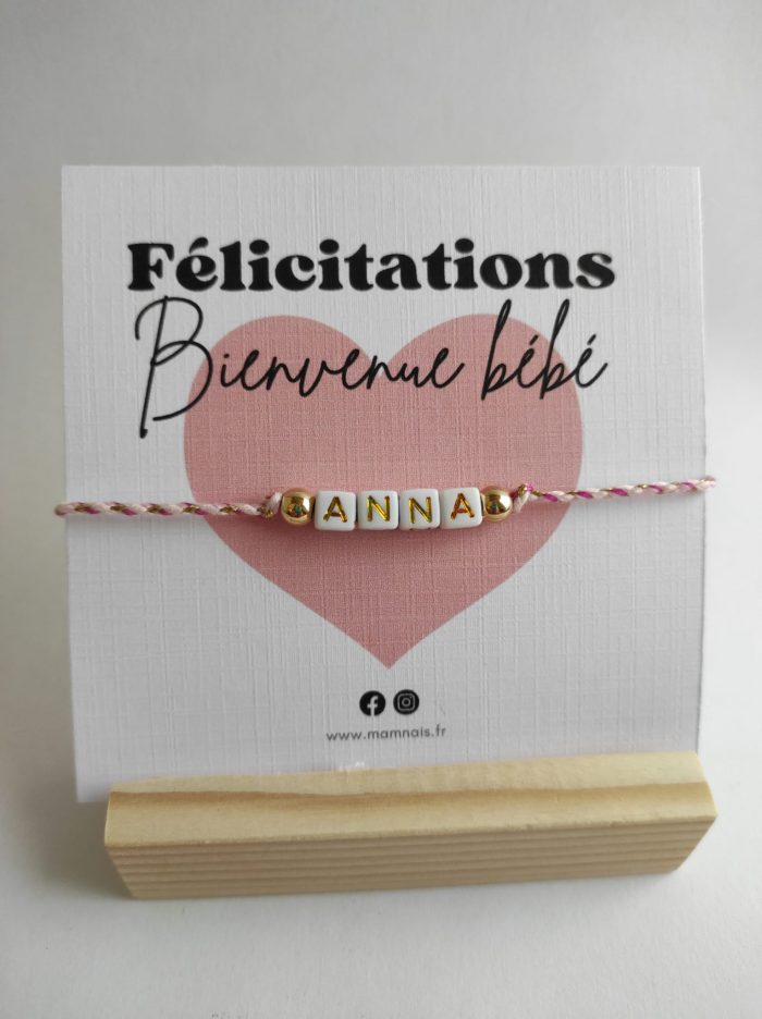 Découvrez cette carte de félicitation est unique et originale avec son joli bracelet prénom pour la maman !