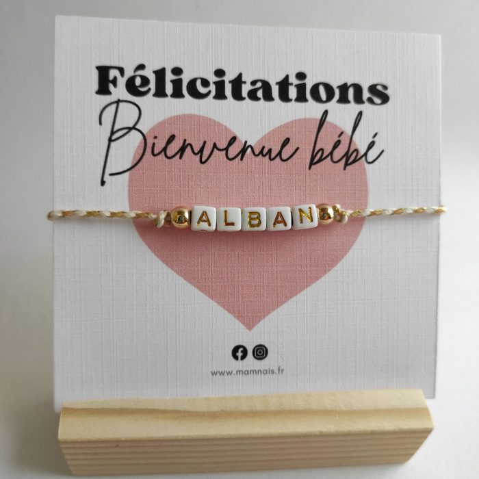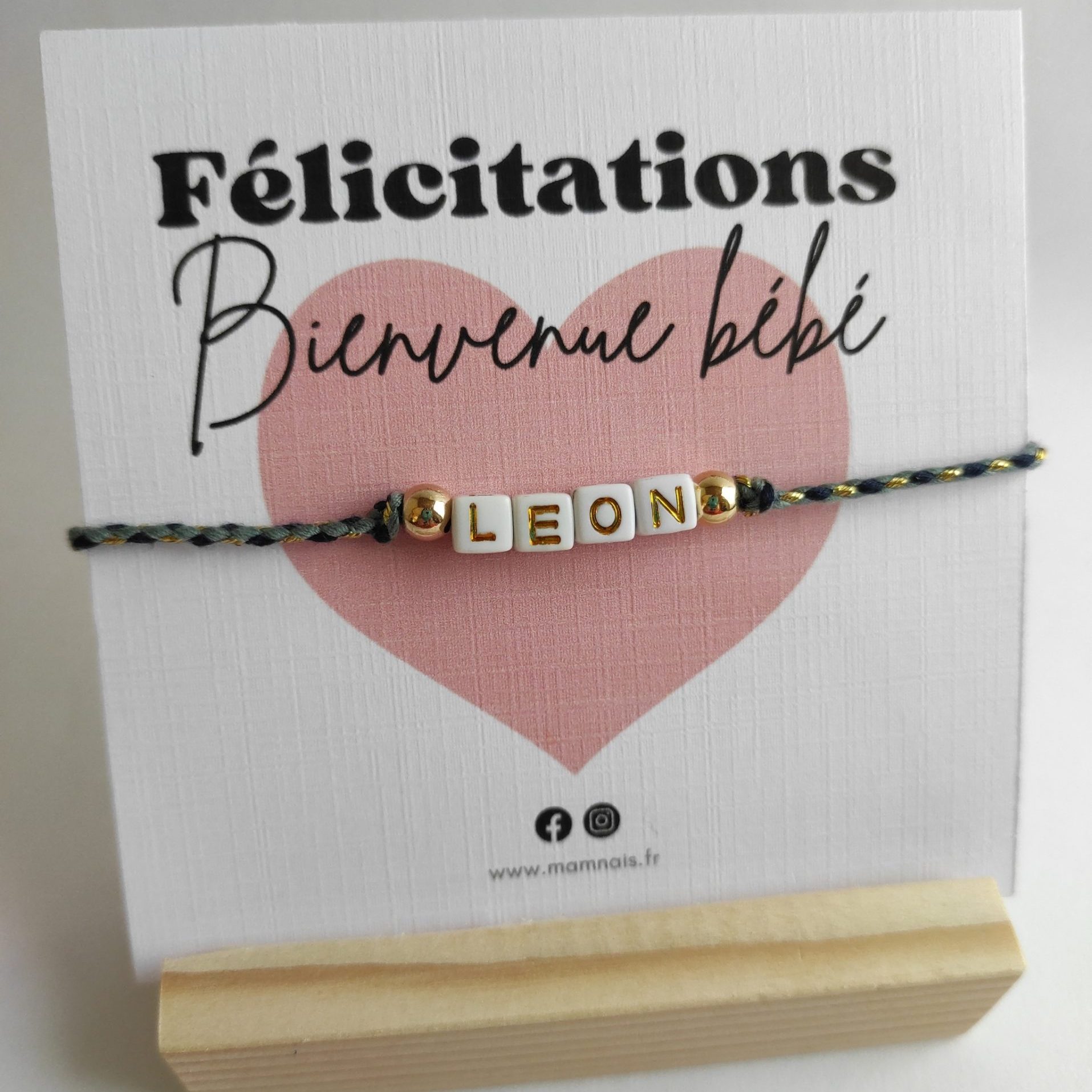 Cette carte ‘Bienvenue Bébé” permettra de féliciter les heureux parents avec une petite attention pour la maman. Un bracelet avec le prénom de son bébé. Effet “Waouh” garanti !