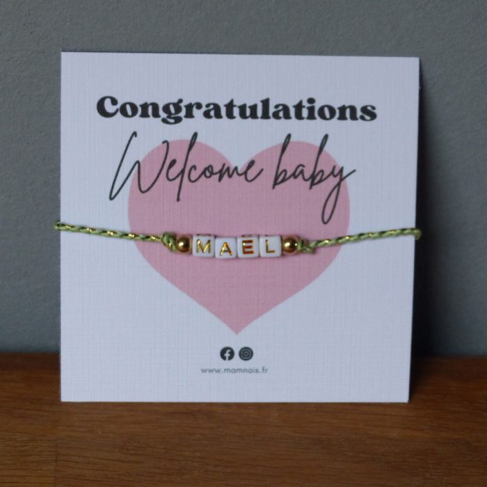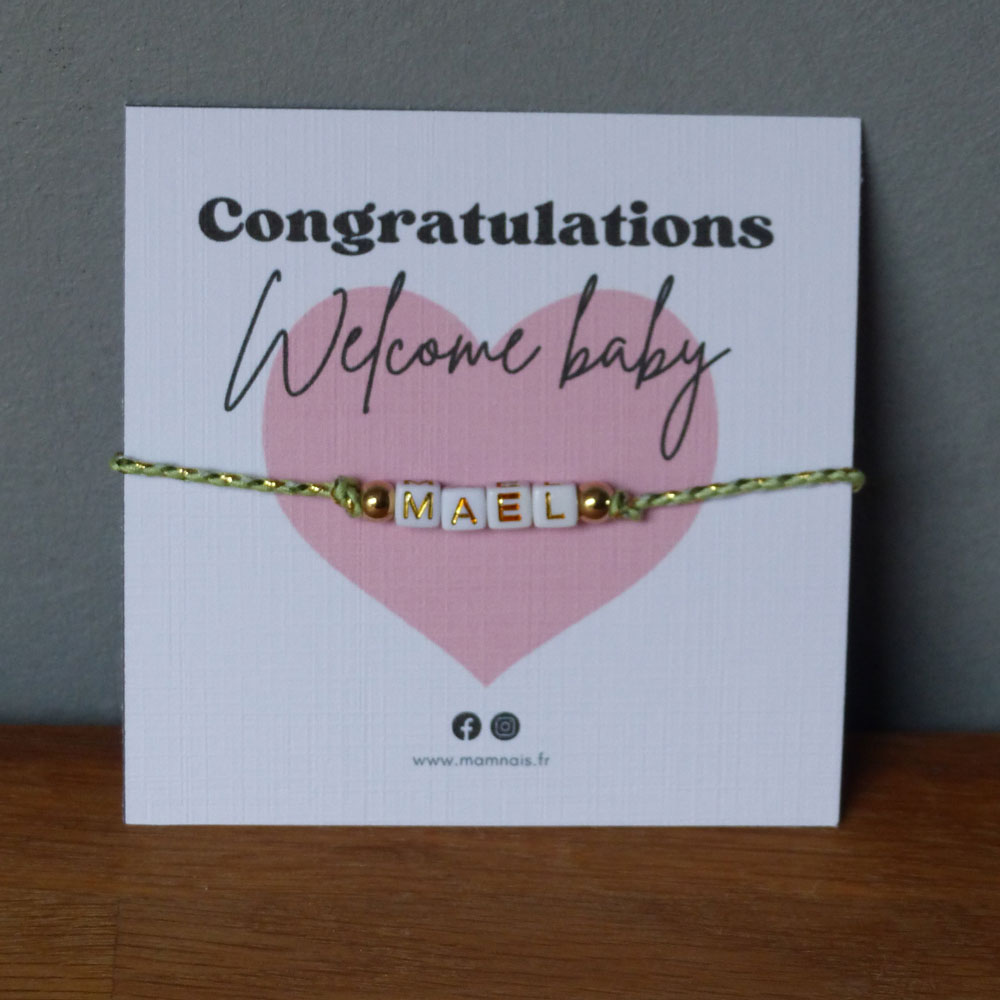 Cette carte “Welcome Baby” permettra de féliciter les heureux parents avec une petite attention pour la maman. Un bracelet avec le prénom de son bébé. Effet “Waouh” garanti !