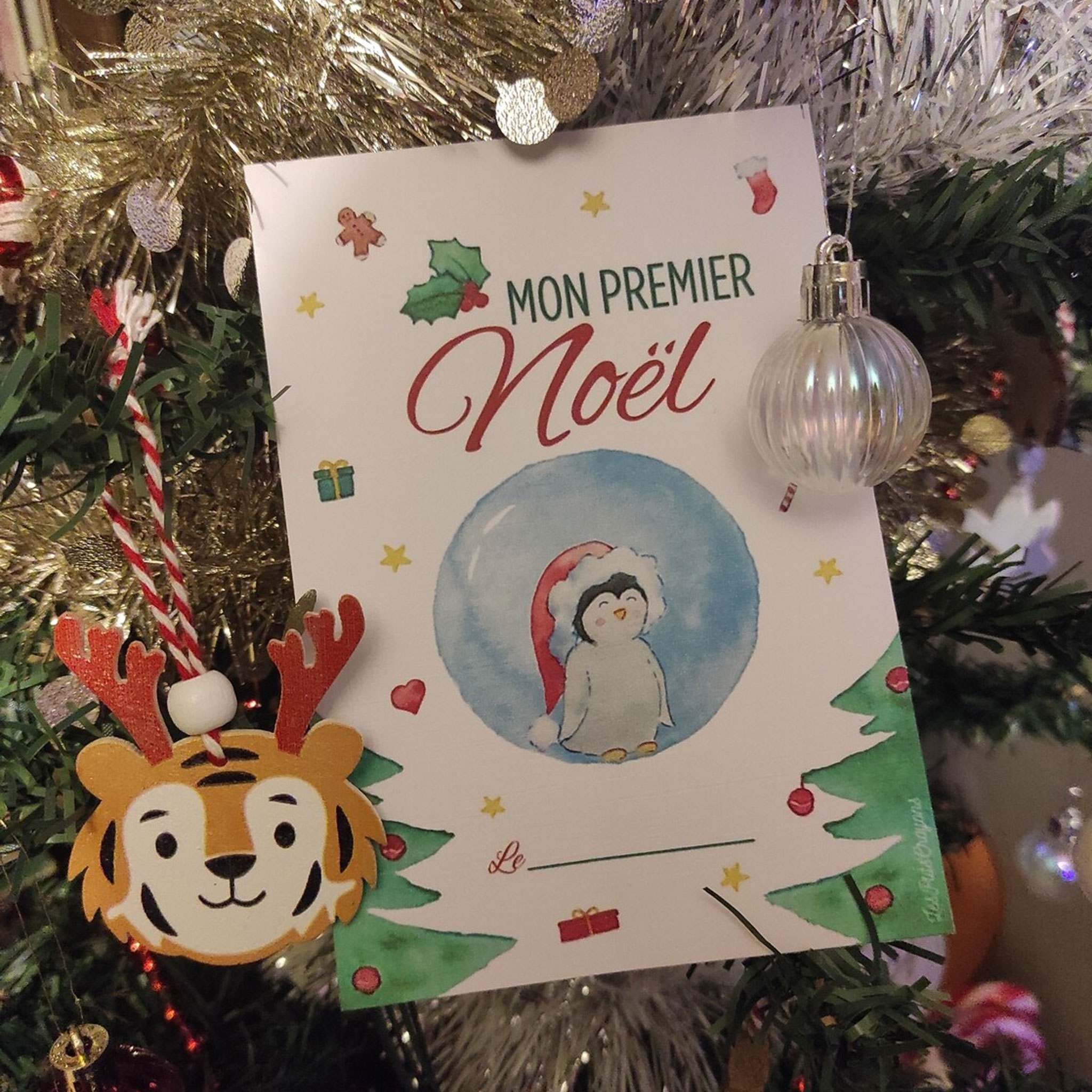 Une carte “Mon premier Noël” (dimension environ 10×15 cm) dessinée à l’aquarelle par @lesptitscrayons.fairepart et imprimée sur un papier cartonné effet « lin » dans notre atelier en France.