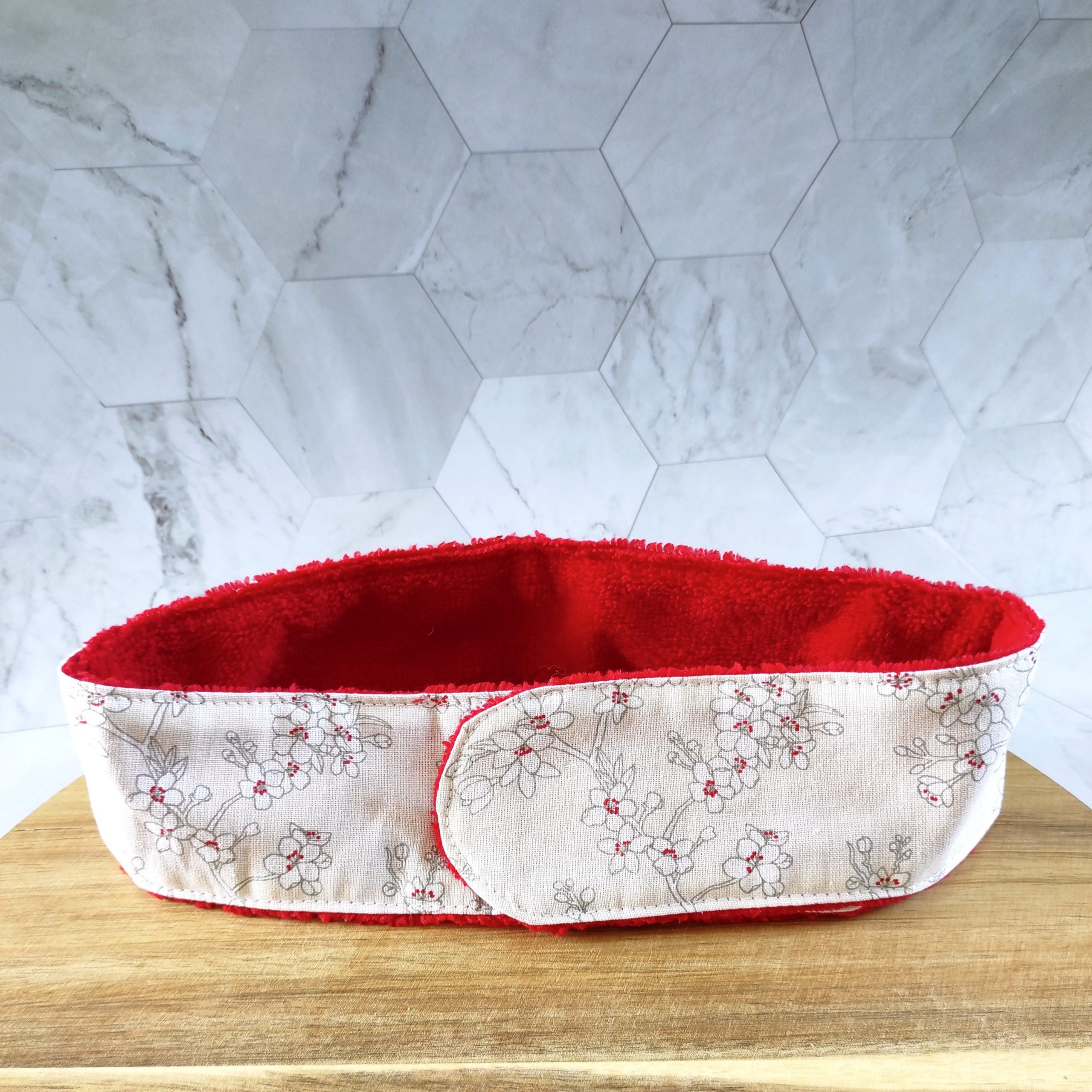- d’un bandeau cheveux en tissu coton et éponge avec un scratch