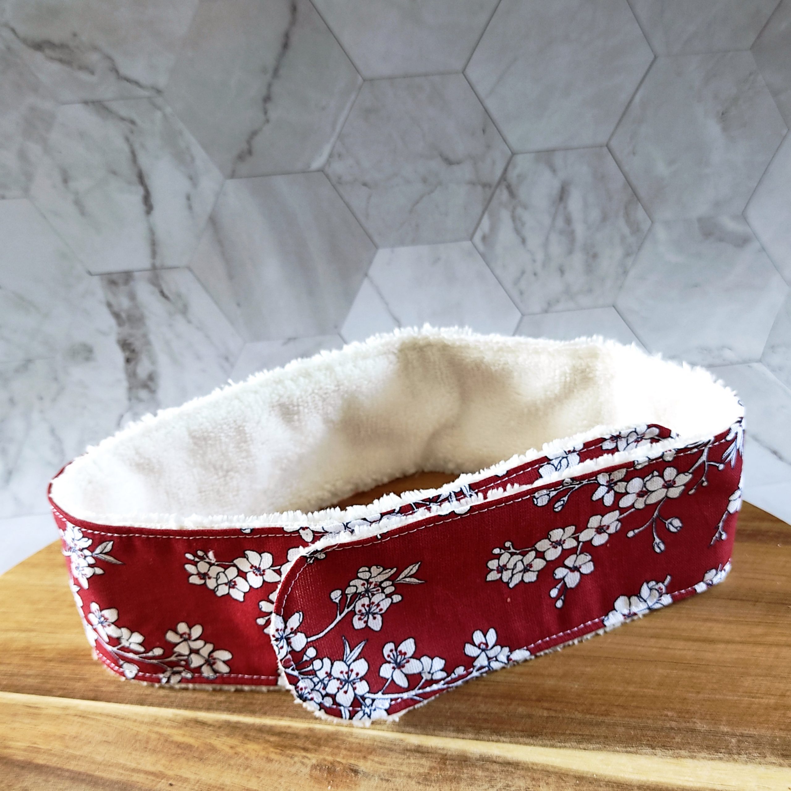 - d’un bandeau cheveux en tissu coton et éponge avec un scratch