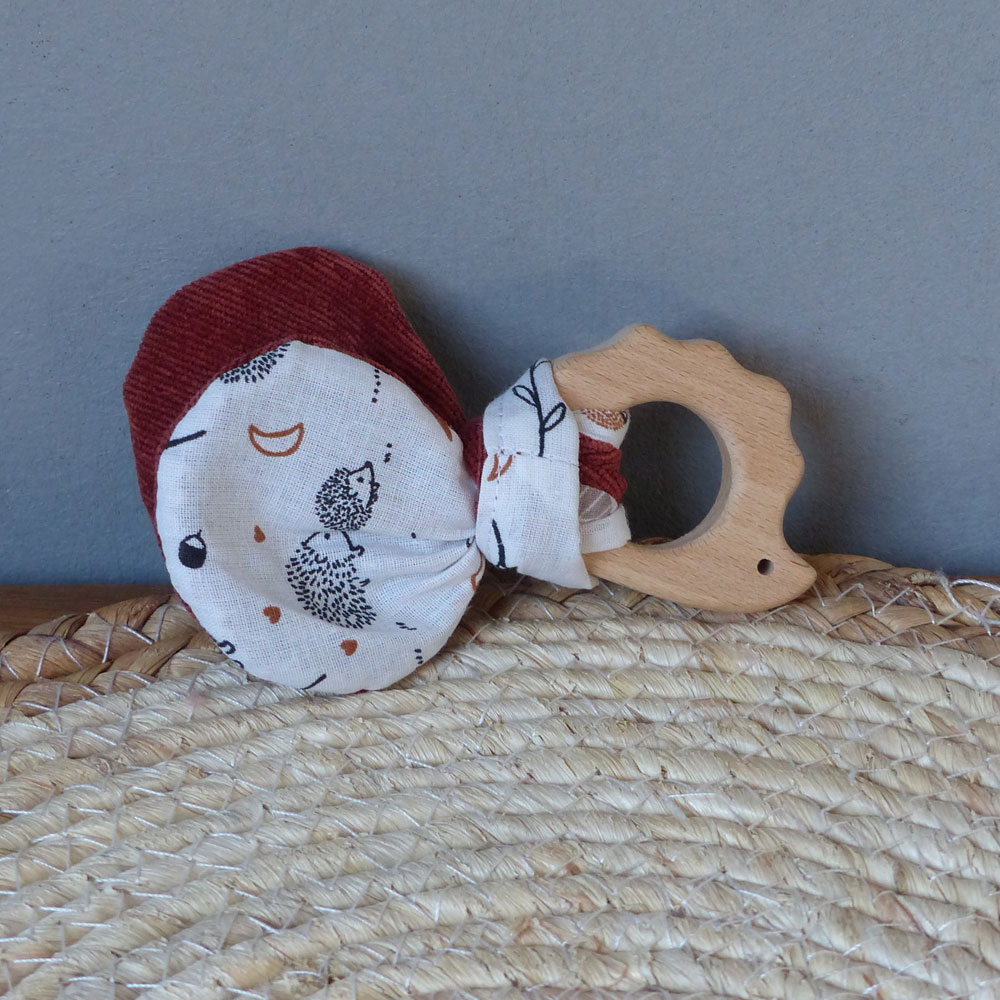 1. Un anneau de dentition “hérisson” en tissu coton imprimé Oeko Tex et velours côtelé. L’anneau, en forme d’hérisson, est en bois de hêtre, résistant à la salive.