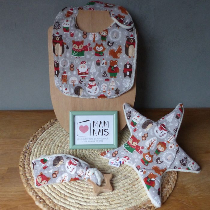 Découvrez le coffret de naissance “Noël des Animaux” qui fera plaisir nouveaux parents et au bébé ! Il est composé 3 accessoires de puériculture tendances et durables :