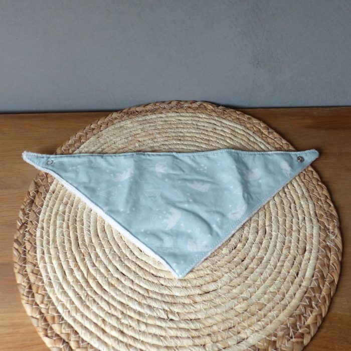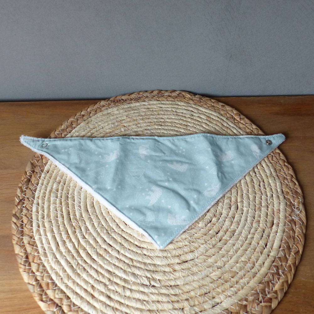 - Un bavoir bandana bébé (0-6 mois) avec bouton pression en tissu coton imprimé Oeko Tex et doudou.
