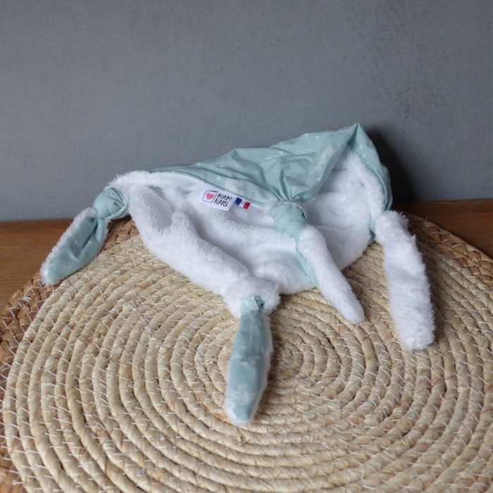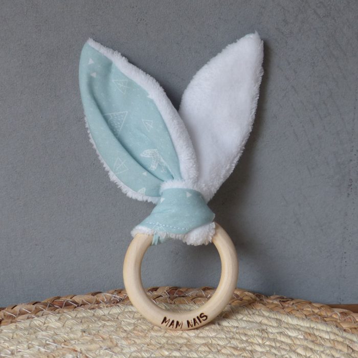 - Un anneau de dentition “oreille de lapin” en tissu coton imprimé Oeko Tex et doudou. L’anneau est en bois brut naturel, 7cm de diamètre, résistant à la salive.