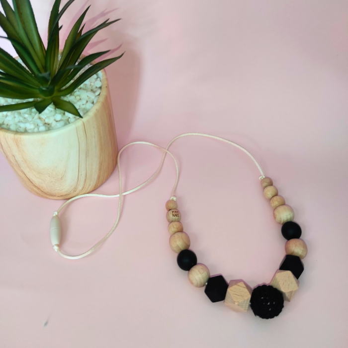 Découvrez le collier d’allaitement et de portage « Charbon » ! En le portant, la maman peut distraire son bébé pendant l’allaitement, un biberon, un câlin ou en écharpe.