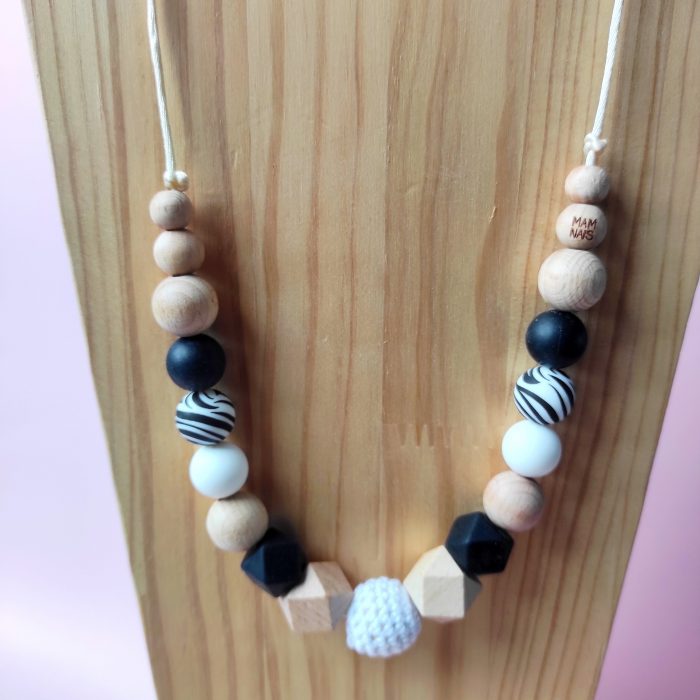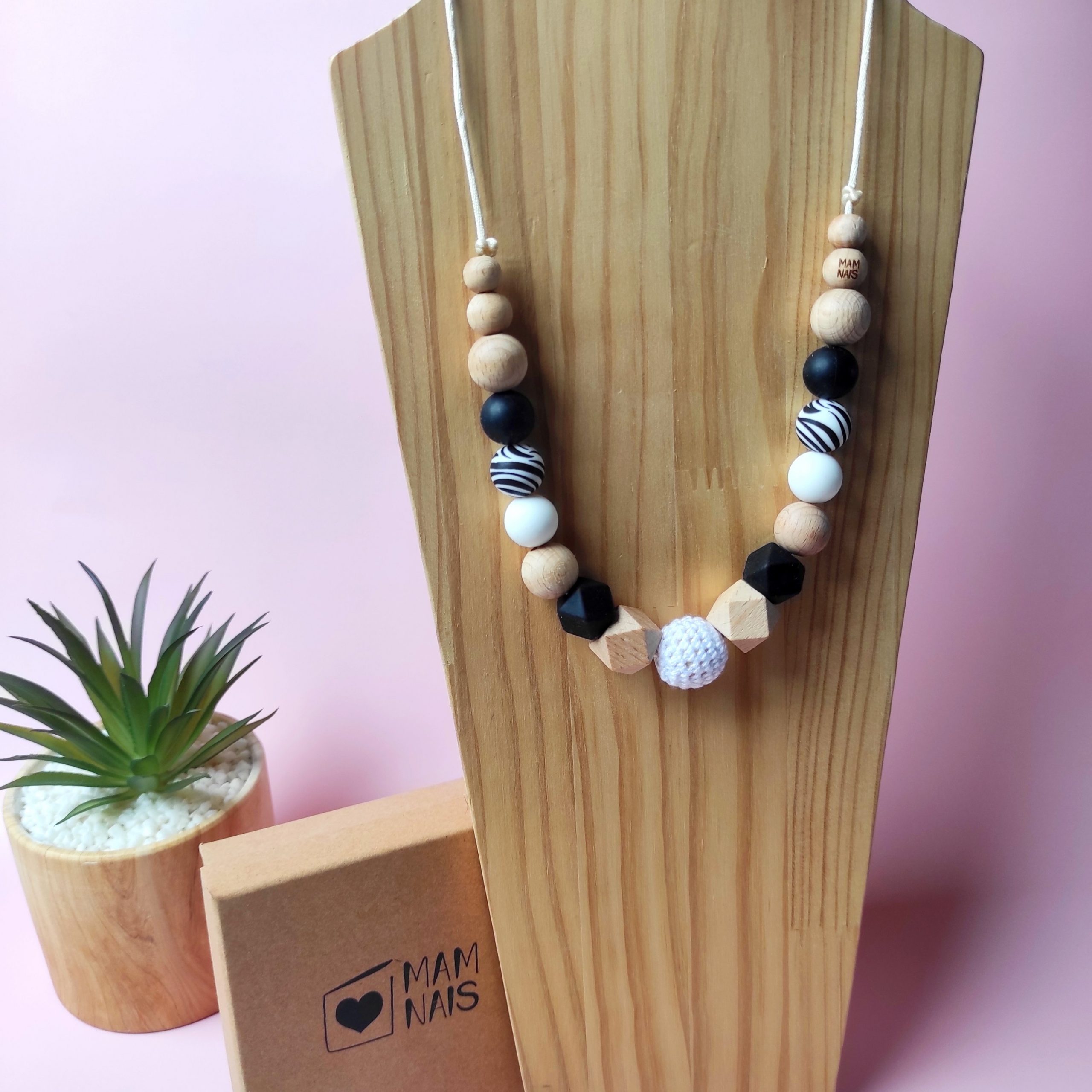 Accueil Bijoux MAM Colliers de portage et d'allaitement Collection Safari Maman Collier d’allaitement et de portage – Zèbre Élégant 🦓